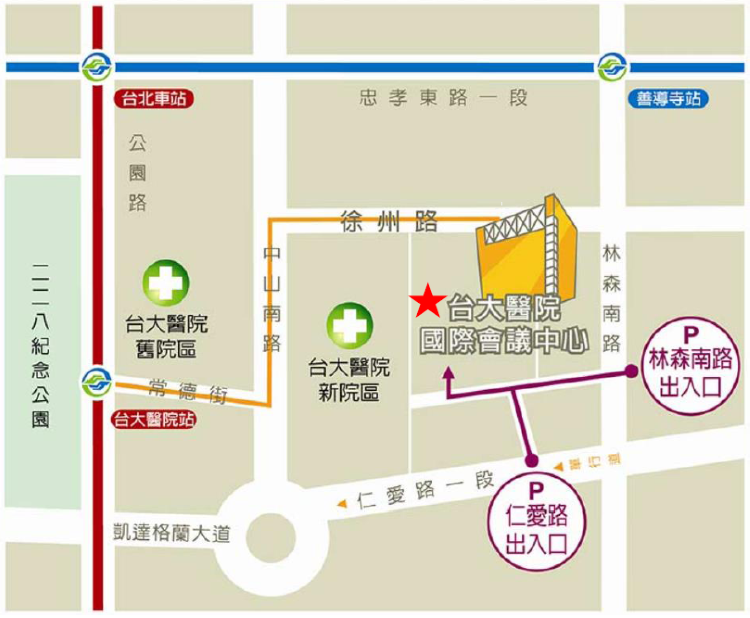 →搭乘淡水信義線(紅線)至台大醫院站2號出口直走常德街,穿越中山南路後往左側直走後再右轉徐州路,步行大約6分鐘即可抵達。